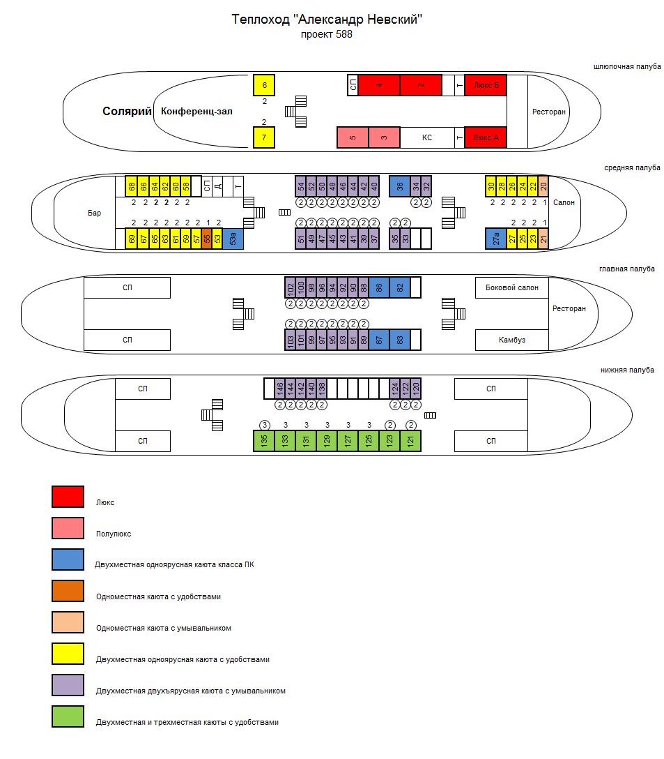 - Доплата за одноместное размещение в каютах категории «Б» составляет 65%, в категории «А» – 50% от стоимости основного места.