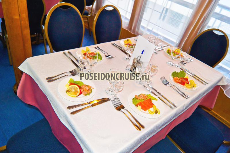 - Трехразовое питание (включая ужин в день отправления и завтрак в день прибытия). В день начала и день окончания круиза питание предоставляется в зависимости от времени посадки и высадки.